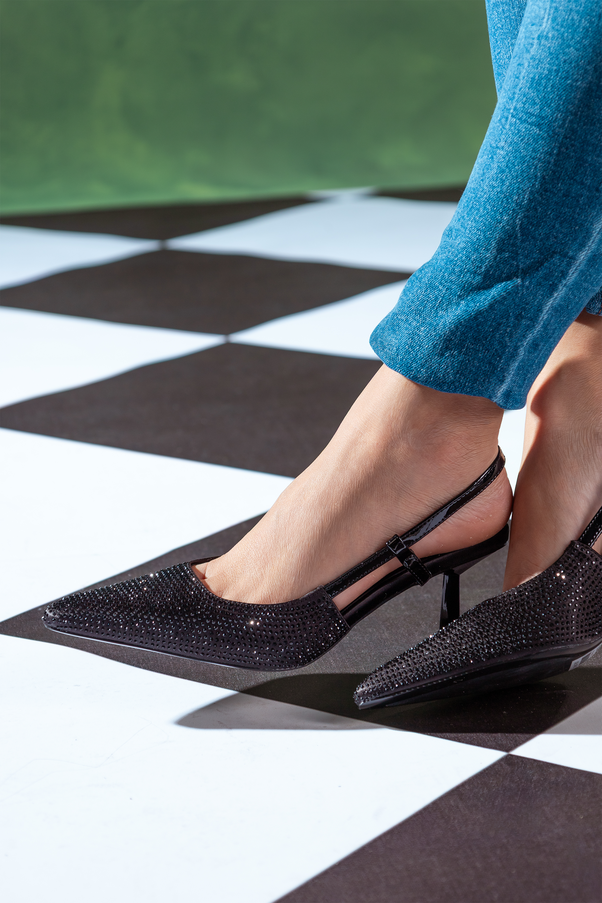 Code No.:01-5507 Heel pumps , strassy leather , pointed toe , Slingback , Heel measures around 5 cm