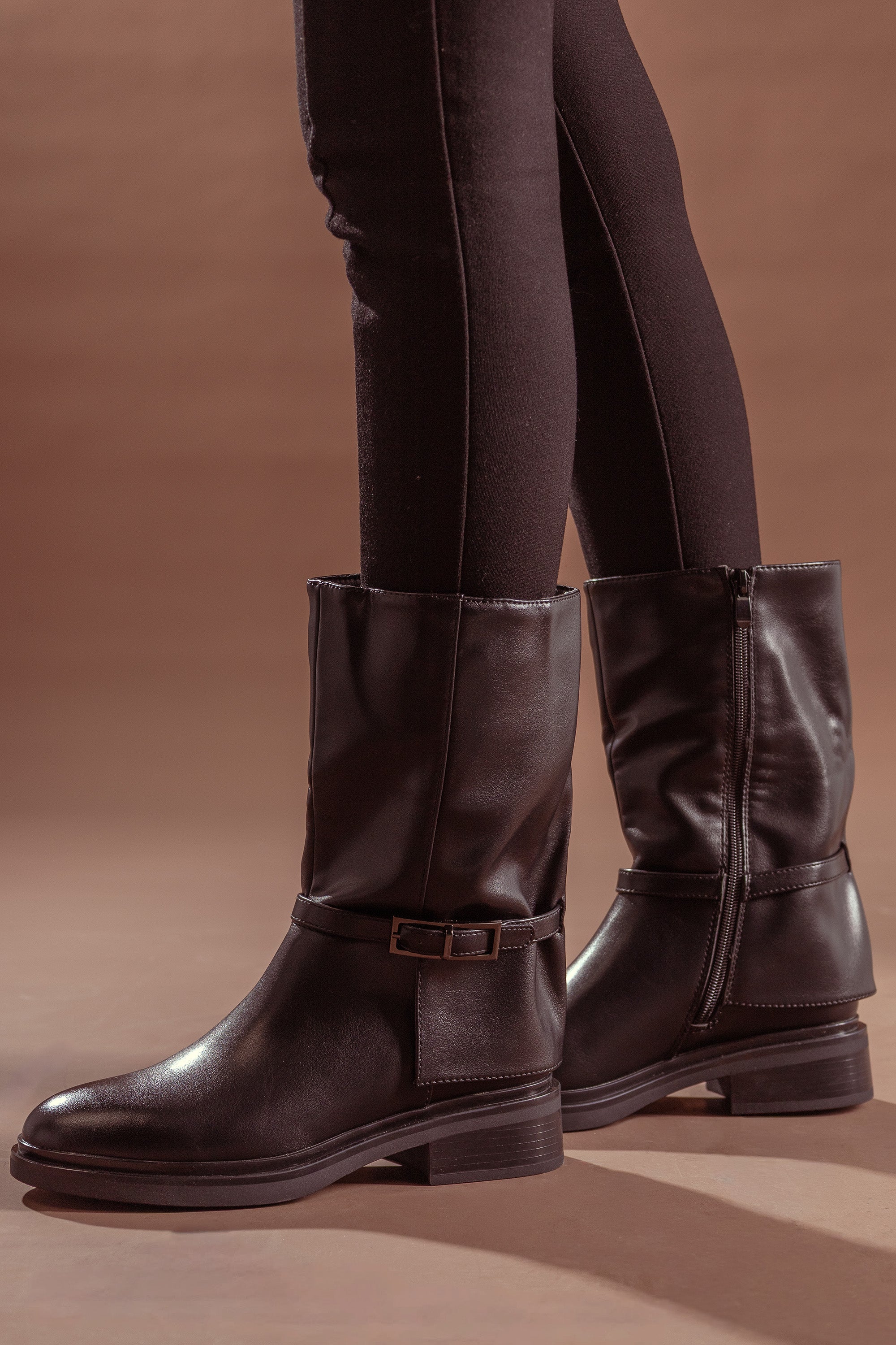 Code No.:01-5596 Flap Half Boot , leather material ,round toe , zip fastening aside, block heel measures around 2 cm