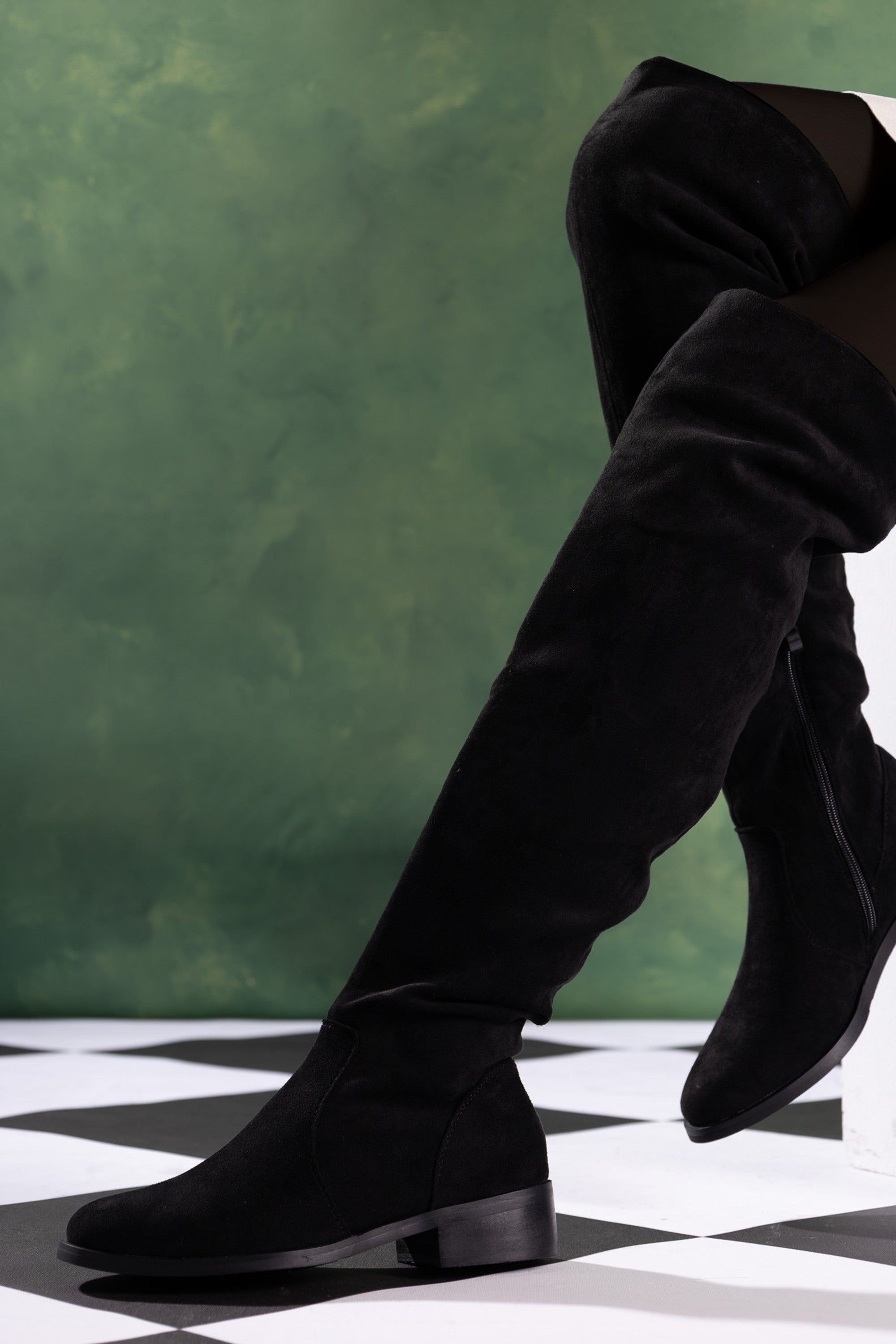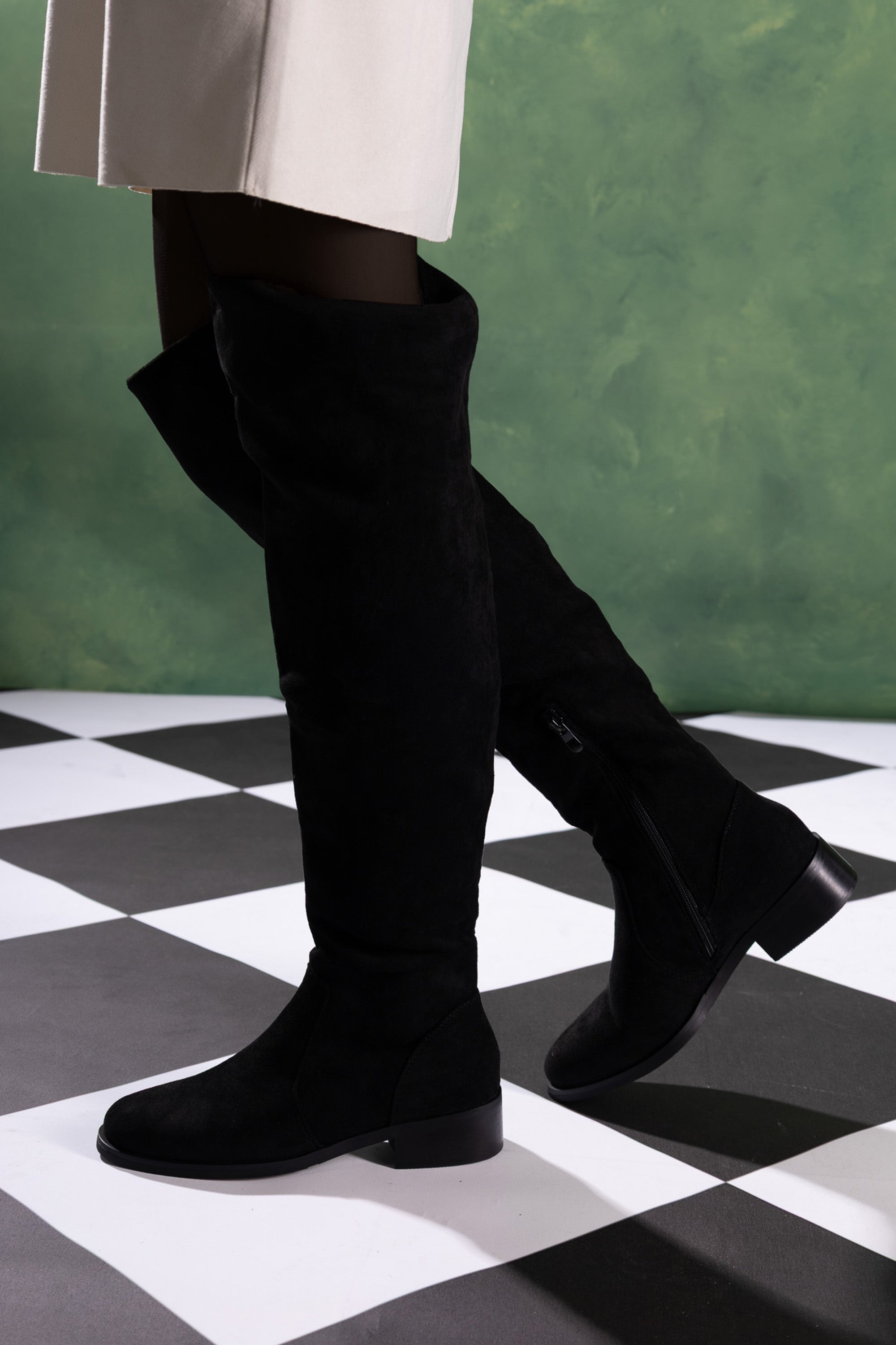 Code No.:01-5587 Under-knee boot , Suede material , zip fastening , round toe , heel measures around 2 cm