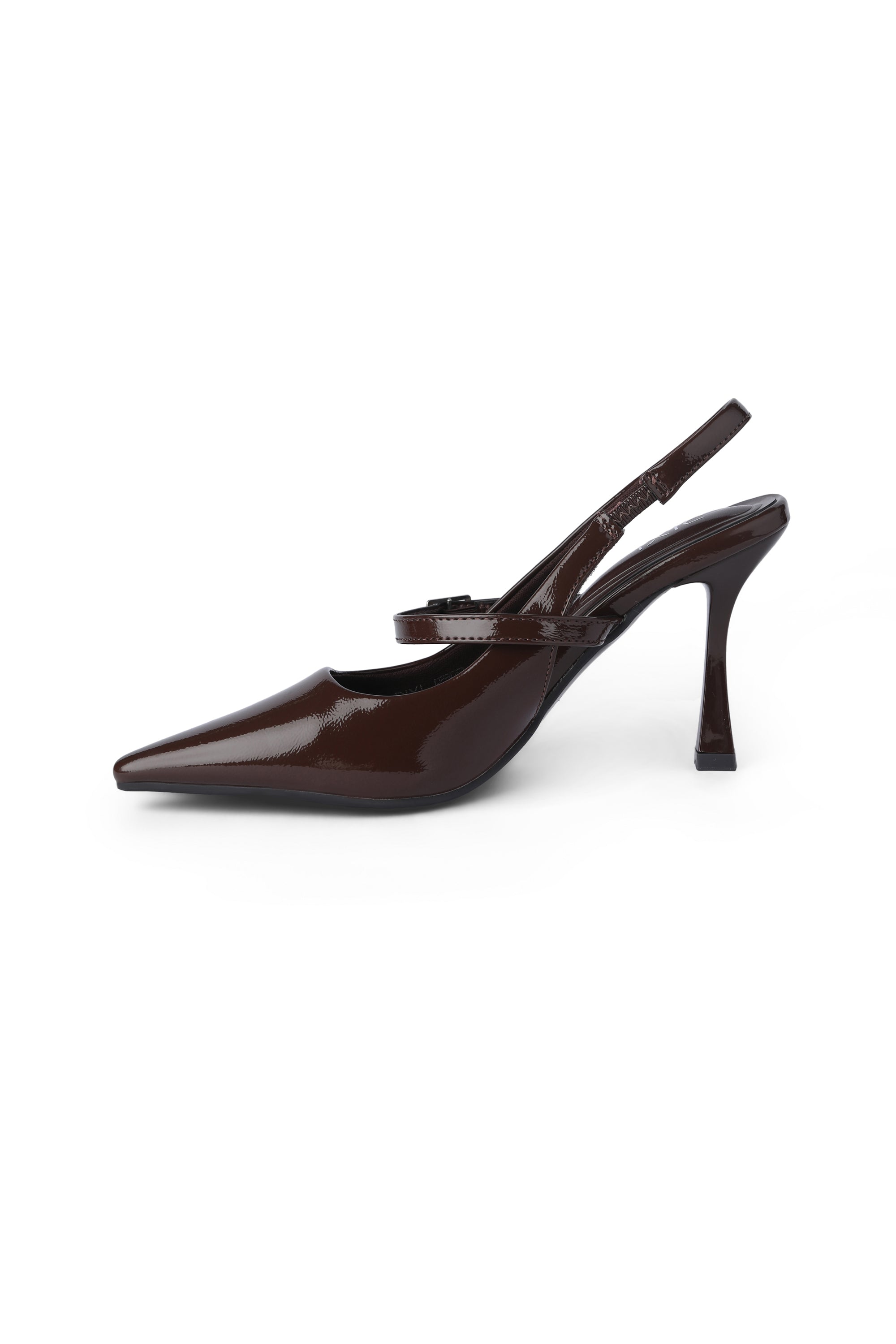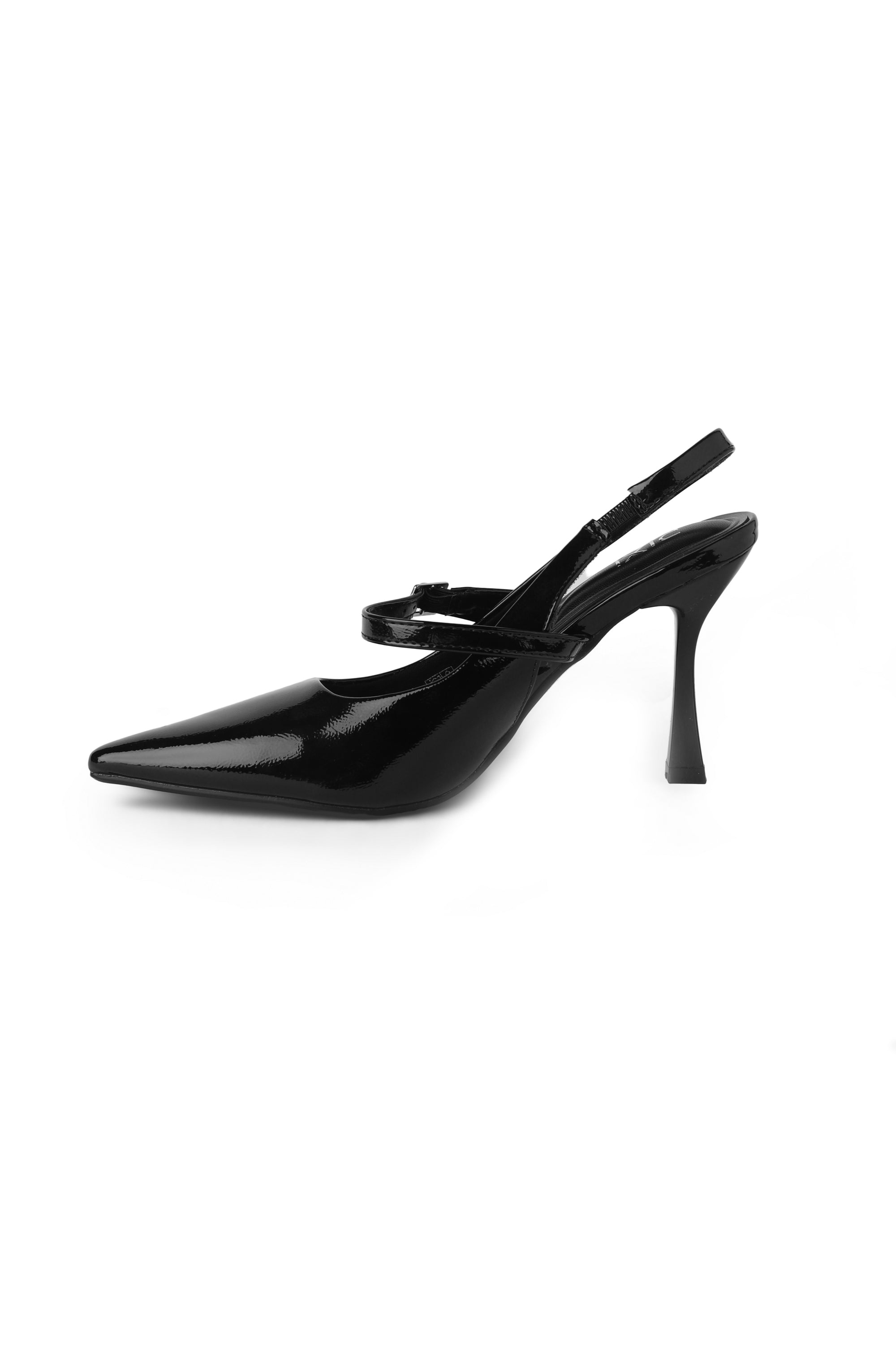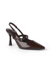 Code No.:01-6046 Pointed toe sling openback pump with a high hight heel , featuring a leather upper and delicate buckle strap , giving a refined look suitable for occasions and daytime wear, heel meausres around cm.
